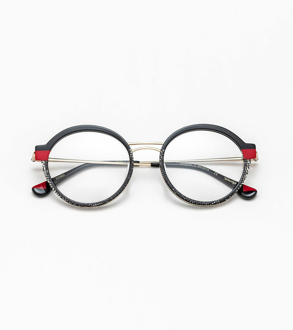 Σύμμεικτος σκελετός με τριπλό φύλλο acetate και διπλή μεταλλική γέφυρα. Οι βραχίονες είναι μεταλλικοί με άκρες που διαθέτουν ξύλινο ένθετο.